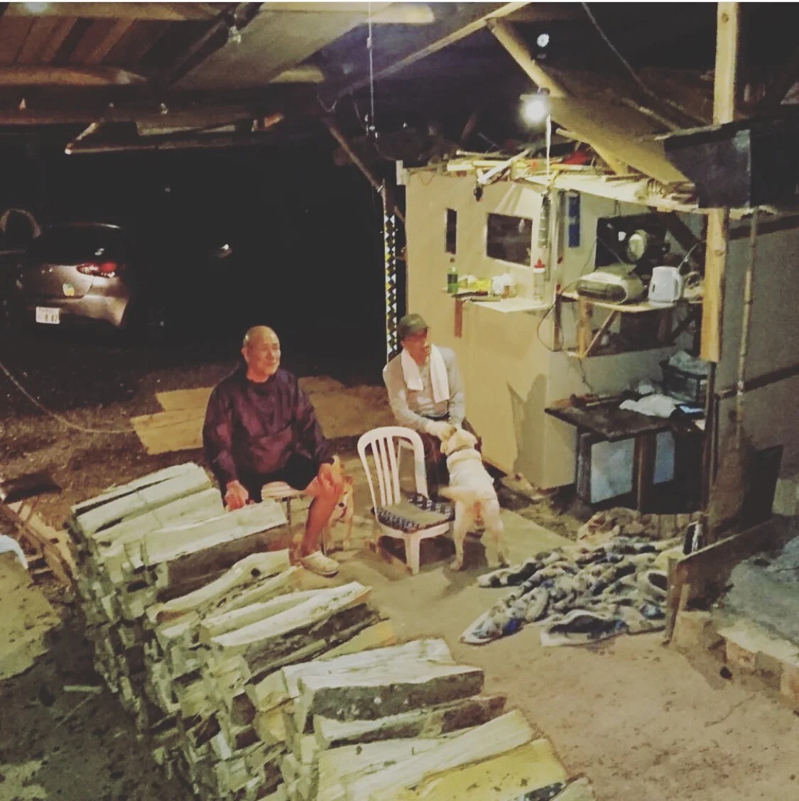 Sada-san(left) and one of his disciples(right) sit in front of the kiln during the firing process.